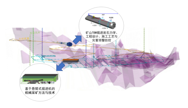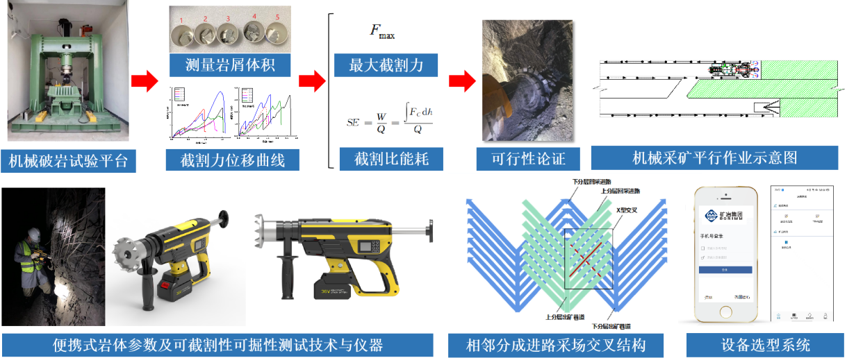 金属非金属矿山“凿岩爆破”开采方式决定了采矿工艺流程无法实现连续作业,而且爆破作业本身具有有害效应与较高安全风险。随着科技水平的发展,煤矿采煤机械、金属非金属矿山采掘机械及全断面隧道掘进机(TBM)等装备与技术相互影响渗透,机械破岩装备向着行业、技术融合的趋势进步,地下矿山迎来了由传统凿岩爆破开采向非爆机械连续开采的新跨越。机械连续开采技术是球友会网站登录入口的重点发展方向。技术方向在机械刀具破岩力学及优化、机械采矿岩石力学、机械采矿工艺、机械采矿机电一体化选型配套、机械开挖岩体稳定性控制及安全保障技术、金属非金属专用机械采掘装备等方面取得了众多创新研究成果,研发形成多项自主知识产权的新一代机械采矿装备及配套产品,构建出一套机械连续采矿的基础理论与技术体系。自主研发的机械破岩试验平台、机械破岩装备选型系统、新型机械破岩悬臂式采矿机、便携式可截割性测试分析仪等,已在众多项目中起到关键支撑作用,并在国内多家地下金属非金属矿山中实现了推广与应用。