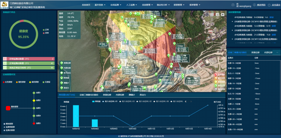 目前,该技术已在城门山铜矿、黑龙江多宝山铜矿、西藏巨龙铜矿等多个大型露天矿山进行了应用。上述矿山采用边坡雷达(GNSS、三维激光扫描仪)进行表面位移监测,同时对内部位移、降雨量、地下水位等进行了监测,通过应用该技术,将矿山边坡稳定性实时分析与各项监测项目相结合,实现了边坡稳定性精准预警,尤其是在汛期、冻融期,成功预警了多次局部边坡坍塌情况,有力保障了矿山安全生产工作,避免了人员伤亡和机械设备、财产损失。